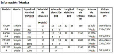 Certificado de test de carga.- - dispositivo de corte automático a tope con resorte de corte automático - monofásico - Incluye soportes (2), pernos de anclaje (4), gancho y gancho doble c/polea - Cable y control de mando : 6 mtrs. de largo Notas : - La garantía de los equipos no cubre piolas en el caso de tecles eléctricos y/o huinches. - Los equipos aquí mostrados son de carga, y no están diseñados para el movimiento de personas, sólo de carga. - Tasa de trabajo S3 20% - S3 = Servicio intermitente periódico, es decir, durante un período de, por ejemplo de 24 horas, el elevador puede ejecutar ininterrumpidamente max. 20% (es decir, 4.8 horas). |