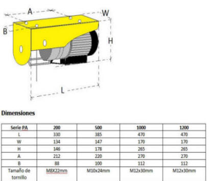 - Protección Clase IP 54 - Incluye abrazaderas y pernos para instalar en viga TECLES ELÉCTRICOS DE 200/500 y 1.200 KGS Certificados de calidad y seguridad : S&Q Mart - CE - Machinery Directive - Low Voltage Directive Certificado de test de carga.- - dispositivo de corte automático a tope con resorte de corte automático - monofásico - Incluye soportes (2), pernos de anclaje (4), gancho y gancho doble c/polea - Unidad, cables, conectores y control con protección anti-humedad.